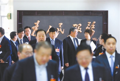 两会期间,近3000名人大代表不忘嘱托,认真审议报告、积极建言献策。会后,代表们又将肩负新使命迈向新征程。这是3月14日下午,黑龙江代表团结束最后一次团组会议,从“为人民服务”的屏风前走出会场。本报记者 杨登峰 摄