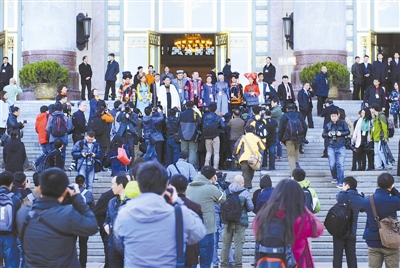 3月15日,十二届全国人大三次会议闭幕会结束后,与会人员在北京人民大会堂门口的台阶上合影留念。本报记者 许之丰 摄