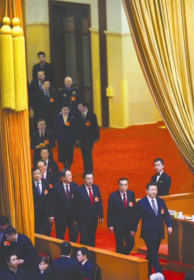 3月8日,十二届全国人大三次会议在北京人民大会堂举行第二次全体会议。党和国家领导人习近平、李克强、张德江、俞正声、刘云山、王岐山、张高丽等同志入场参会。本报记者 杨登峰 摄