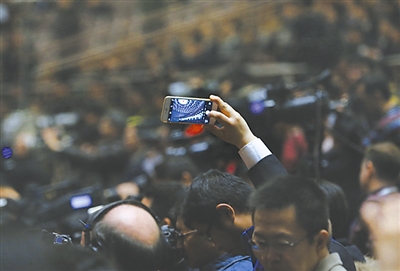 3月15日,十二届全国人大三次会议闭幕会上,一位记者用手机拍摄大会会场。本报记者 杨登峰 摄
