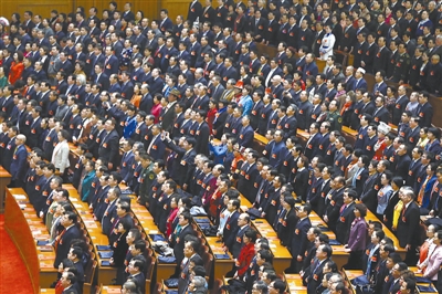 3月15日,十二届全国人大三次会议闭幕会上,代表们齐声高唱国歌。两会后,代表们将肩负使命,踏上新征程。