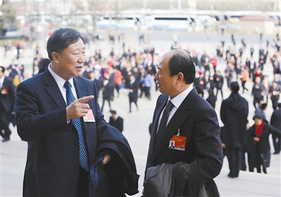 3月8日上午,在北京人民大会堂东门外,两位来自企业的全国人大代表高宝玉(图左)和姚庭财就企业和职工发展双赢问题在交流。本报记者 杨登峰 摄