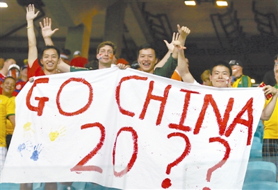 图为2014年7月5日,在巴西世界杯荷兰队与哥斯达黎加队的四分之一决赛中,看台上的中国球迷打出标语表达对中国足球的期望。 新华社发