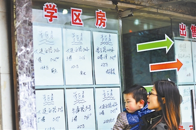 3月18日,上海,一位家长带着孩子在中介门口看学区房房源。