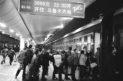 3月17日晚,甘肃天水火车站,务工人员乘坐3669次列车进疆务工,这也是从天水发往新疆乌鲁木齐的新年首趟务工专列。全程运营31个小时,15个沿途停车站,122元的低廉票价……连续15年,这趟列车已成为务工人员进疆的首选交通工具。 杨艳敏 摄/中新社