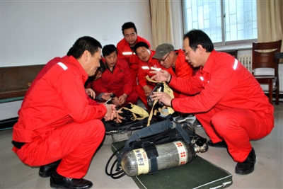 图为3月10日,中石化集团公司井下作业工金牌得主、 XJ103队作业一班班长杨新前(右一)正在向员工们讲解正压式空气呼吸器的正确佩戴方法。