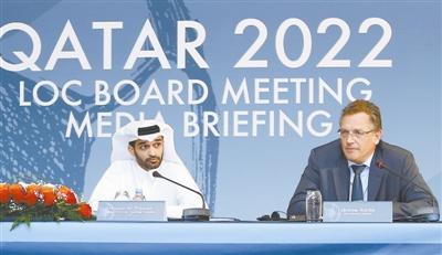 经过多次协商,国际足联与卡塔尔世界杯组委会最终决定2022年世界杯在11月举行。图为国际足联秘书长瓦尔克(右)在新闻发布会上。CFP供图