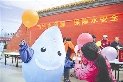 3月22日,在东城区景山街道皇城根遗址公园,小朋友被扮成“小水滴”的志愿者吸引。
