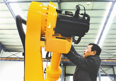 3月11日,张子蓬在检查一台即将出厂的工业机器人。