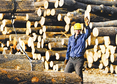 3月21日,一名工作人员指挥吊车装卸木材。