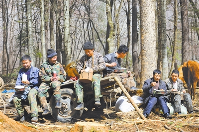 3月21日,在八家子林业局庙岭林场,伐木工人在吃午饭。