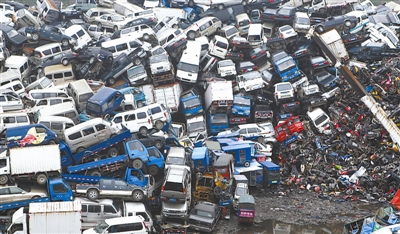 3月19日,在浙江省杭州市,堆积如山的报废车,黄标货车、轿车、三轮摩托、两轮摩托及电动车密密麻麻地堆在一起。