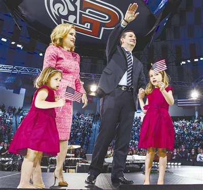 3月23日,克鲁兹携妻女在弗吉尼亚自由大学参加竞选活动。