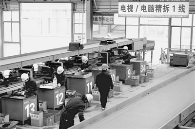 3月26日,工人在位于兰考县的深圳格林美再生资源循环产业园内拆解废旧家电。