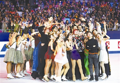 3月29日,2015年国际滑联世界花样滑冰锦标赛在上海东方体育中心“海上王冠”体育馆落幕。选手们在表演滑结束后用自拍杆和观众一起自拍。新华社记者 王丽莉 摄
