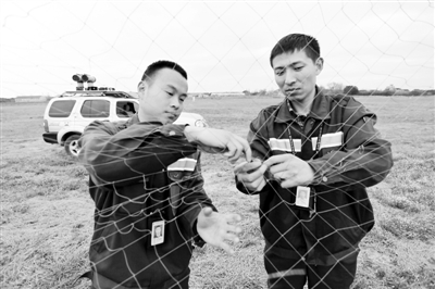 3月26日,倪春艺(右)和队友张易清理拦鸟网上的杂物,提高拦鸟的成功率。