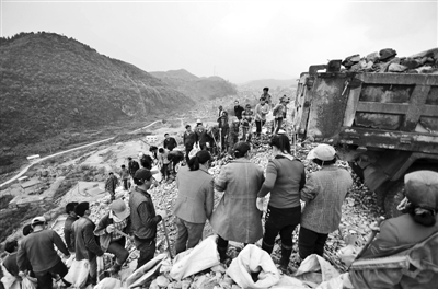 工人们在石坡上排着长队等候载着废矿石的货车卸货。