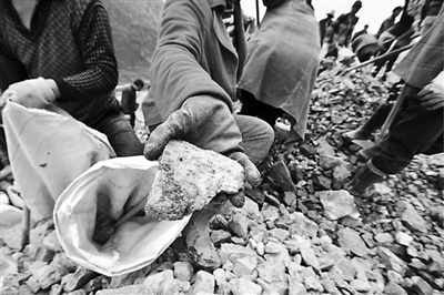位于湖南郴州资兴市与宜章县交界处的瑶岗仙矿区,面积23.325平方公里,是我国钨业的起源地,也是湖南省最大的黑钨精矿生产基地。这里有一群另类的黑钨“淘宝族”,少则几十人,多时上百人,年龄以四五十岁居多,在矿区山脚下长期租住房子。他们起早贪黑,长年累月在废矿石堆里淘取为数很少的黑钨“宝贝”。一辆辆载着废矿石的货车到来,他们就蜂拥而上,用锄头刨、用手捡拾卸下的矿石。他们会挑选含有少量黑钨的矿石,然后用锤子砸开,将里面的黑钨取出。