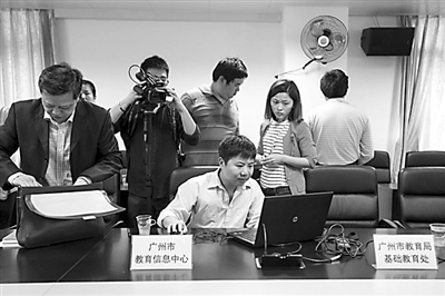 具有广州市户籍的适龄儿童及政策性照顾借读生可登录该系统报名,但该系统不适用于随迁子女及择校生、普通借读生,这三类人员必须到现场报名。图为广州市教育局工作人员现场演示如何网上报名。林宏贤/CFP