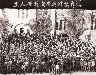 工人学校开学典礼时,毛泽东等中央领导人与学员合影。(资料图片)