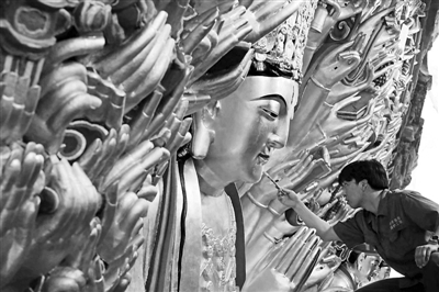 近日,在重庆市大足区宝顶山千手观音造像修复工程现场,工作人员为造像表面刷封护剂。封护剂就像“护肤霜”,能够对千手观音的“皮肤”起到很好的保护作用,也有利于今后对造像表面的清洁。目前,重庆大足千手观音造像修复工程的石质、彩绘和贴金等主体修复均已完成,修复工程进入最后的“护肤”阶段。
