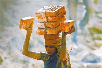 当地时间4月1日,尼泊尔勒利德布尔,一名印度移民女工在砖厂里干活。每年的冬天和春天,都会有数千名印度和尼泊尔的季节性移民工人到加德满都附近的砖厂里做工。 东方IC供图