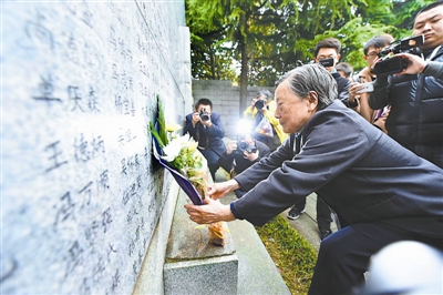 4月5日,南京大屠杀幸存者夏淑琴老人向遇难者名单墙献花。