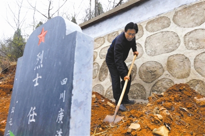 4月4日, 杨金玉正在整理烈士坟头,这些土堆里都埋着当年参加抗战的烈士遗骸。