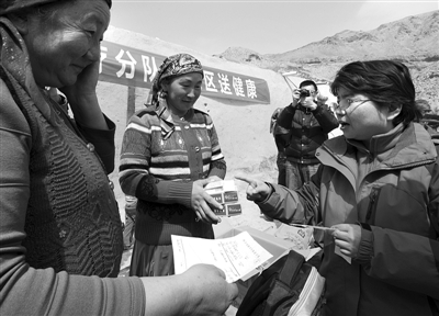 4月6日,新疆卫计委工作组医疗专家(右)为牧民发放药品。
