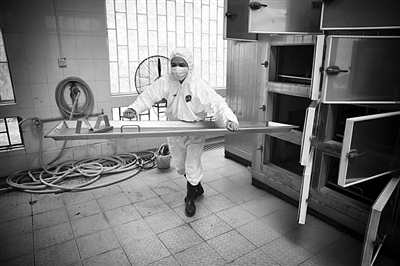 负责遗体接运的是殡仪馆的运输部,共有33位接运工,5台接运车。所有的接运工几乎都是保持着全年360多天的工作节奏,难得有假期。由于接运遗体的通知太多,有时,工作时间甚至超过了24小时,都来不及休息一会儿。接运工平均每天要接运40具遗体,最多一天近60具。