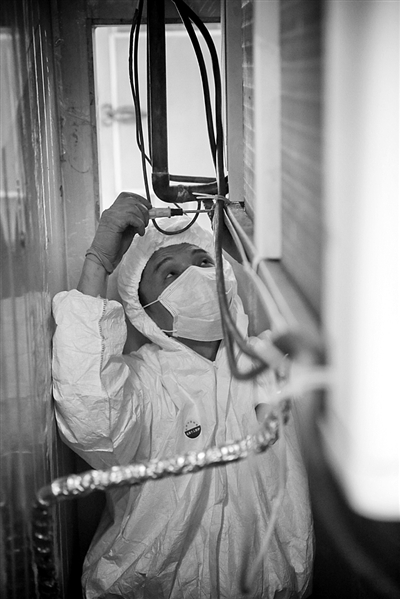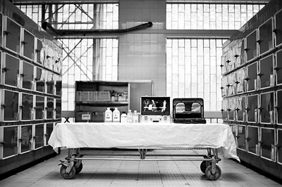 维修工抽出摆放遗体的容器以腾出空间,他要从方孔中爬进去维修。