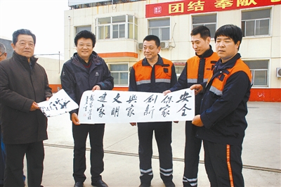 当晚,中国铁路文联等组织的“送书画到站区”小分队一行10人,为秦皇岛铁路地区的边远车站、工区现场创作书画作品60余幅。中国铁路文联主席兼秘书长、铁路书协主席王勇平表示:“像这样的送文化下基层活动,我们要形成机制,经常开展。” 图为书法家将作品送给一线职工。