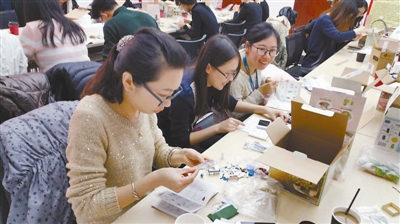 图为职工们正在DIY制作情人节水晶球礼物。刘旭 摄