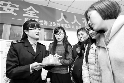 当日,合肥市包河区烟墩街道食品安全办公室工作人员走进社区,向社区居民普及食品安全知识,防范由饮食不当引起的疾病。4月7日是世界卫生日,今年世界卫生日的主题是“食品安全”。新华社记者 张端 摄