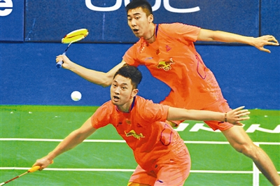 4月8日,在新加坡室内体育场举行的2015年新加坡羽毛球公开赛中,中国选手柴飚(前)/洪炜以2比0战胜中华台北选手陈宏麟/王齐麟,晋级下一轮。 新华社发(邓智炜摄)