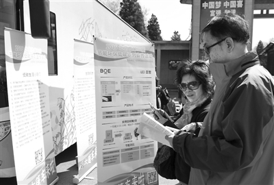图为市民在天坛公园门口翻阅由“大篷车”发放的节能环保宣传材料。