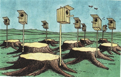 滥伐树木,植被遭毁,鸟禽失去了生存的家园。好心人搭建了临时住所……绿化环境才是维系地球生物链平衡的治本之策。【斯洛伐克】鲁波米尔