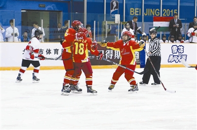 4月9日,中国队球员在进球后庆祝。 当日,在北京举行的2015国际冰联女子冰球世锦赛甲级B组比赛中,中国队以7比3战胜匈牙利队。新华社记者 公磊 摄