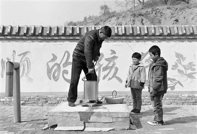 宁夏西吉县平峰镇高山教学点唯一的老师张怀春从水窖里提出一桶之前收集来的雨水,这桶水足够他和9个孩子用好几天(3月23日摄)。