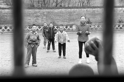 宁夏泾源县泾河源镇底沟村教学点教师马吟在和学生一起做游戏。这个教学点只有马吟和丈夫于广银两名老师以及17名孩子。这对夫妻教师已经在这里任教7年(3月19日摄)。