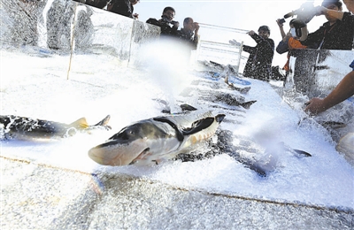 当日上午,3000尾大规格中华鲟在长江三峡大坝下游湖北宜昌胭脂园放流长江,放流规格、数量为历年来大规格个体放流之最。
