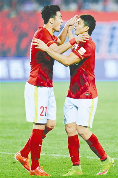 4月12日晚,在2015赛季中超联赛第5轮比赛中,广州恒大主场以6比1大胜辽宁宏运。图为恒大队球员庆祝进球。