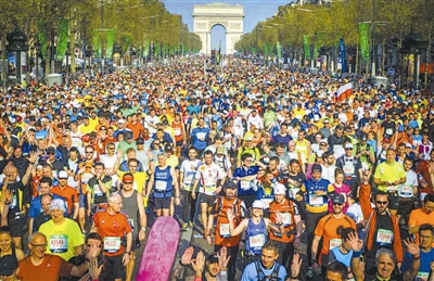 当地时间4月12日,第39届巴黎马拉松赛在香榭丽舍大街鸣枪。包括近百名来自中国的长跑爱好者在内的150多个国家和地区的54000余名选手获得本届比赛的参赛资格。肯尼亚选手马克·科里尔以2小时05分49秒的成绩获得男子成年组冠军。埃塞俄比亚选手梅塞雷特·芒吉斯图以2小时23分24秒的成绩获得女子成年组冠军。新华社记者 陈晓伟 摄