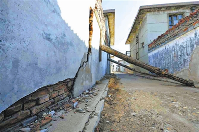 山西省左云县秦家山村的一处房屋出现裂缝,村民用了两根木桩顶着(4月13日摄)。秦家山村曾是远近闻名的挖煤“明星村”。煤矿关闭后,村民失去收入来源,纷纷外出打工。