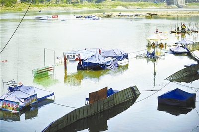 4月14日,嘉陵江水位持续上涨,重庆磁器口江边一大片的临时游乐设施被江水淹没,浸泡在水中。