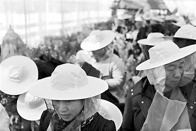 游客戴着蜂帽,“欣赏”大棚里的油菜花 。