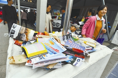 4月12日,在山东省日照市春季电视购车节上,参展商发放的宣传单页大部分被市民们随手扔掉,现场各种宣传单乱堆乱放,垃圾遍地。地中海 摄/CFP