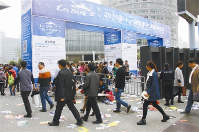 4月11日,2015第十一届春季大河国际车展在郑州国际会展中心举行。车展现场人流如织,地面广告遍地,形成脏乱场面。