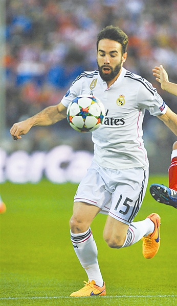 4月14日,皇家马德里队球员卡瓦哈尔在比赛中突破。