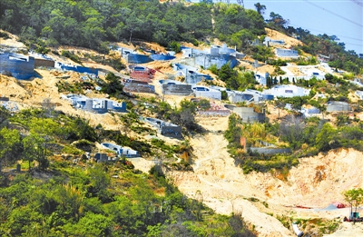 在福清市海口镇洋坂村,大片的青山被大量的“活人墓”蚕食侵占(4月16日摄)。
